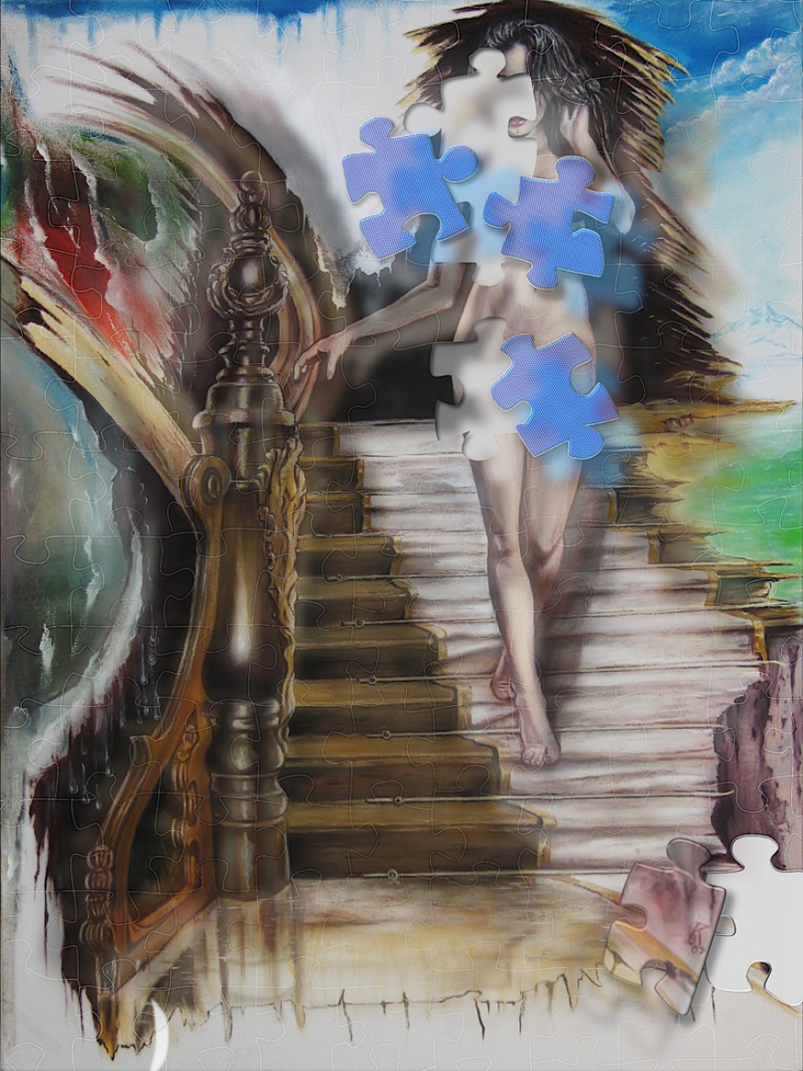 staircase (oil; 2007 and puzzle pieces added by using combined painting technique; 2025-10-25)